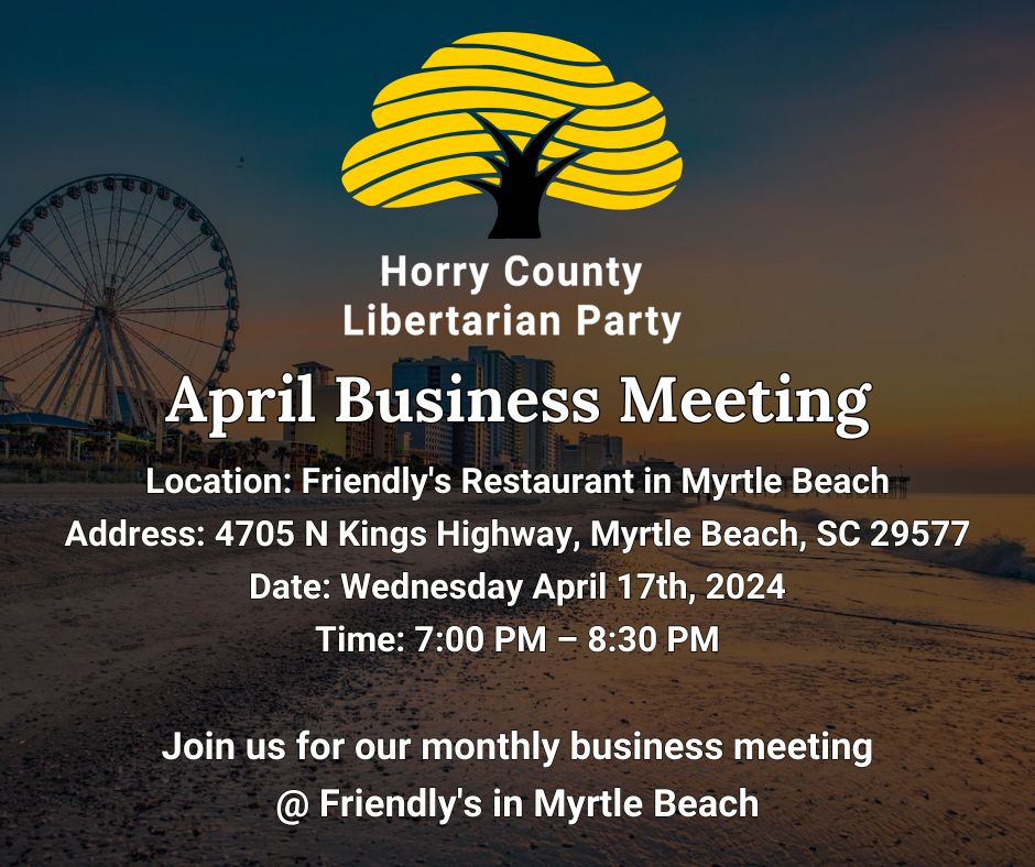 April 17 | Myrtle Beach Horry County Libertarian Party – April Business Meeting Date, Time & Location When: April 17, 2024 7:00 pm – 8:30 pm Venue: Friendly's Restaurant (4705 N Kings Hwy, Myrtle Beach, SC, 29577) Category: Business meeting