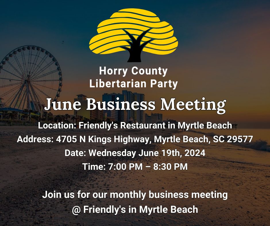 June 19 | Myrtle Beach Horry County Libertarian Party – June Business Meeting Date, Time & Location When: June 19, 2024 7:00 pm – 8:30 pm Venue: Friendly's Restaurant (4705 N Kings Hwy, Myrtle Beach, SC, 29577) Category: Business meeting