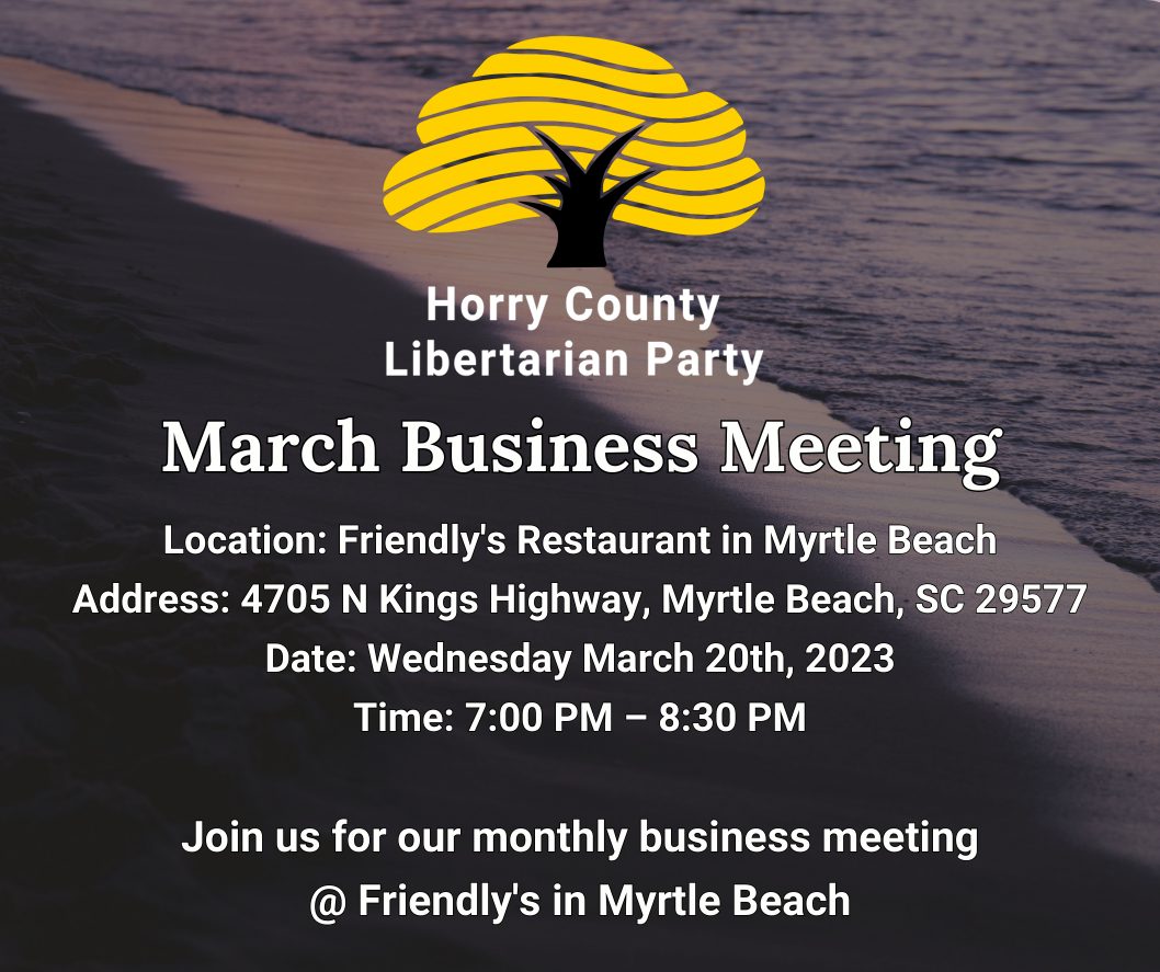March 20 | Myrtle Beach Horry County Libertarian Party – March Business Meeting Date, Time & Location When: March 20, 2024 7:00 pm – 8:30 pm Venue: Friendly's Restaurant (4705 N Kings Hwy, Myrtle Beach, SC, 29577) Category: Business meeting