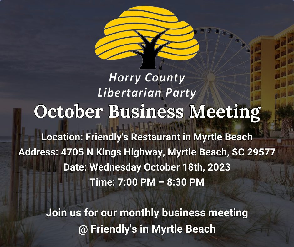 October 18 | Myrtle Beach Horry County Libertarian Party – October Business Meeting Date, Time & Location When: October 18, 2023 7:00 pm – 8:30 pm Venue: Friendly's Restaurant (4705 N Kings Hwy, Myrtle Beach, SC, 29577)