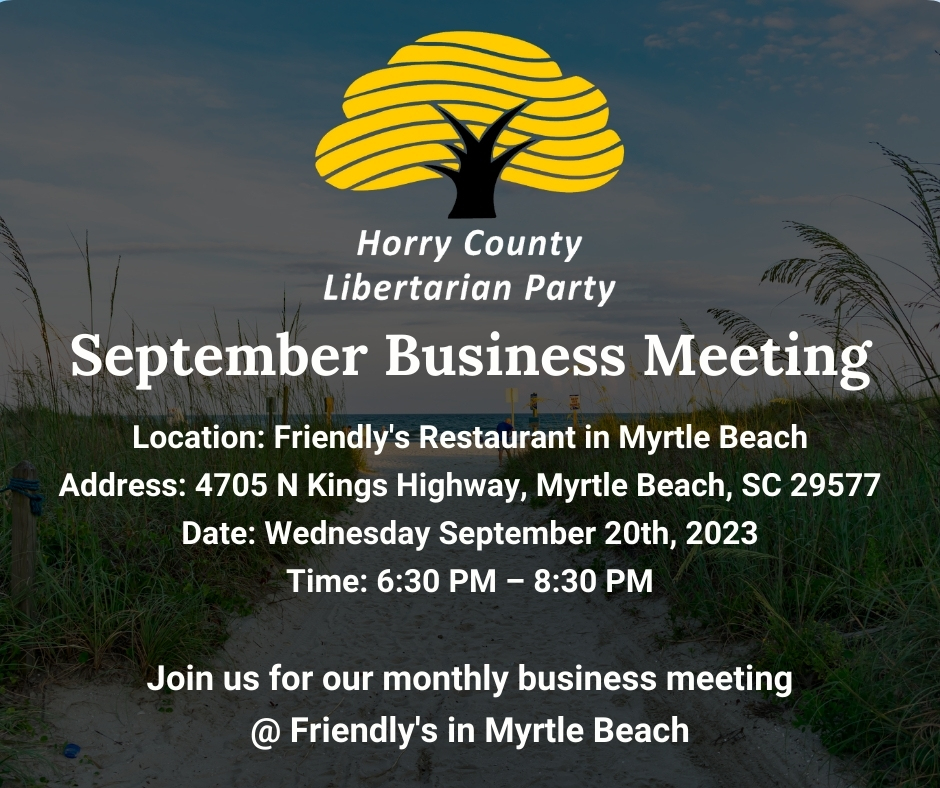 September 20 | Myrtle Beach Horry County Libertarian Party – September Business Meeting Date, Time & Location When: September 20, 2023 6:30 pm – 8:30 pm Venue: Friendly's Restaurant (4705 N Kings Hwy, Myrtle Beach, SC, 29577) Category: Business meeting